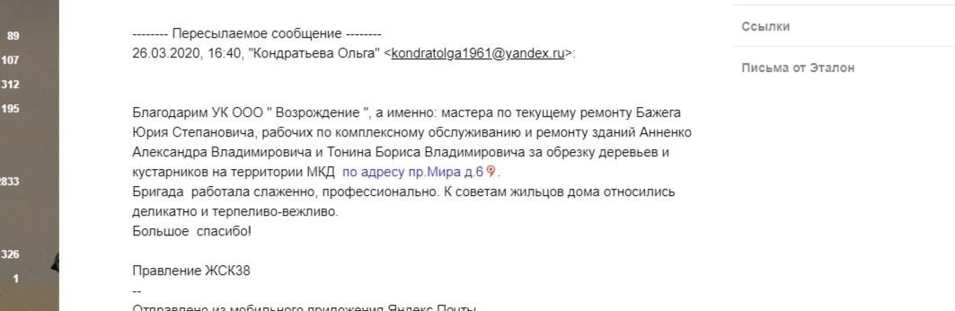 "Благодарим УК ООО " Возрождение ", а именно: мастера по текущему ремонту Бажега Юрия Степановича, рабочих по комплексному обслуживанию и ремонту зданий Анненко Александра Владимировича и Тонина Бориса Владимировича за обрезку деревьев и кустарников на территории МКД по адресу пр.Мира д.6.